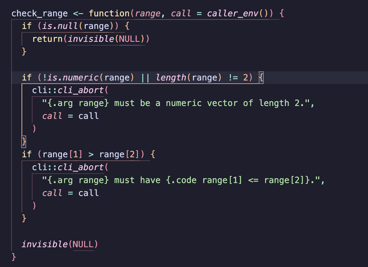 Next up is the idea about guides, which are the horizontal lines that show the scope of each function and control structure. So far, they are showing up in grey, and you could remove them completely if you want, but I kinda like it. Especially if you turn on the colors.