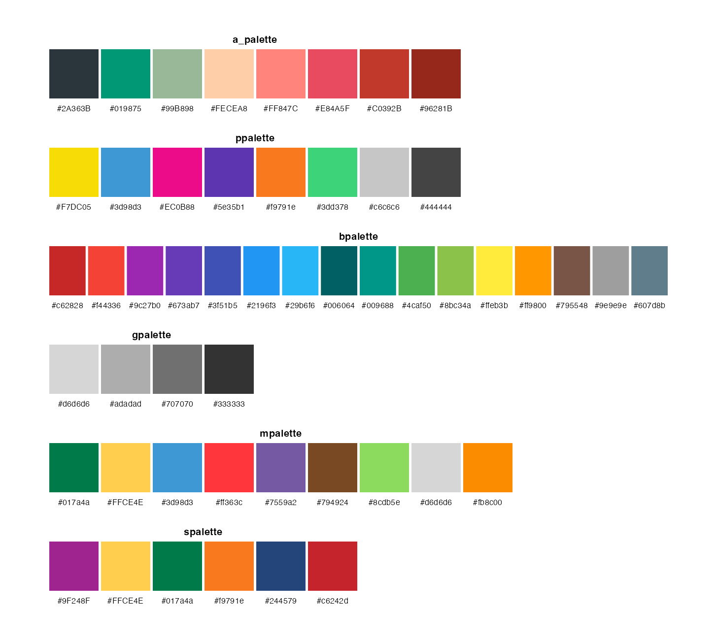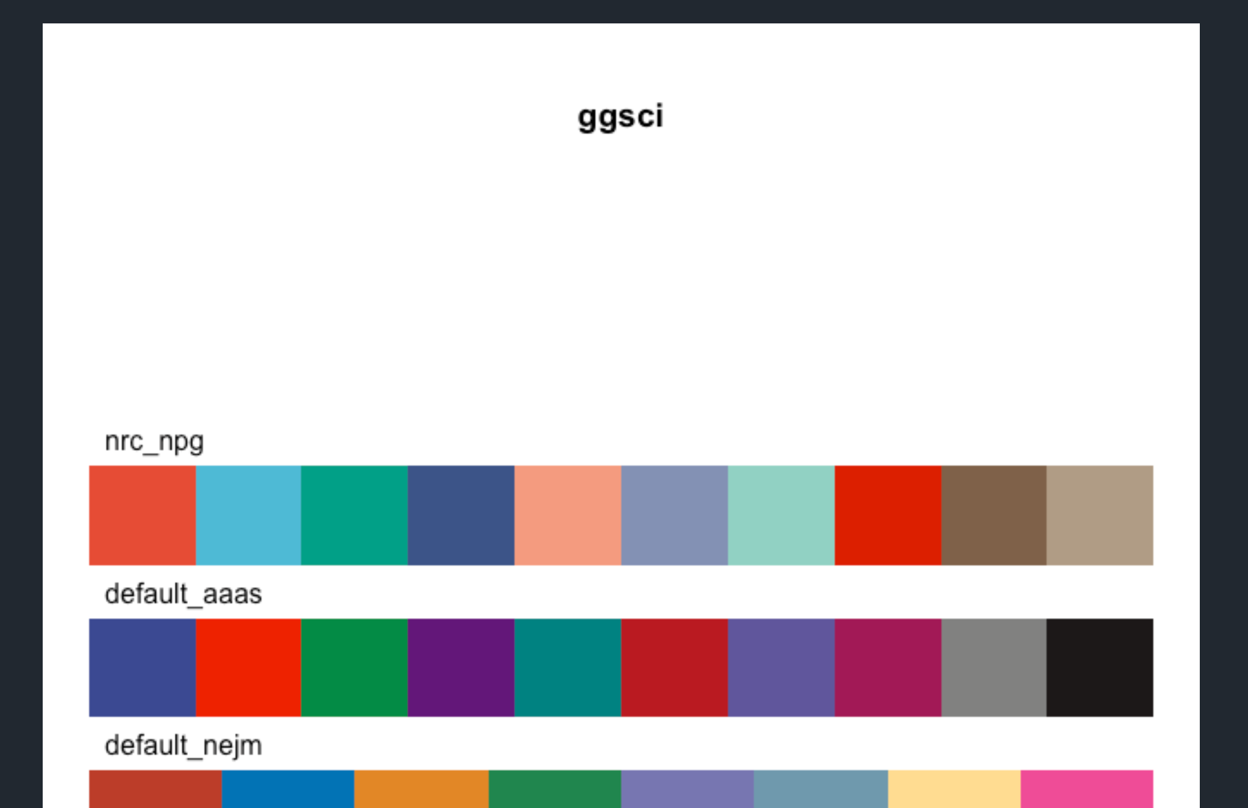 While they look perfectly fine, there were a couple of things I was not perfectly happy with. The images appeared blurry because of the compression I was using. It didn’t contain any information about the colors themselves, so users would need to use a color picker to easily extract colors from the readme. I originally took the approach of prioritising that the palette stretched and took up the whole width. And while that looks very nice, it makes it hard at a glance to see how many colors were in any given palette. Lastly, because of my lack of skills at the time, I wasn’t able to get the dimensions right of the images produced, and I would thus get varying distances between the palette name and the palettes in the pictures. As seen below, the ggsci palette has a much larger gap than the awtools we saw earlier.