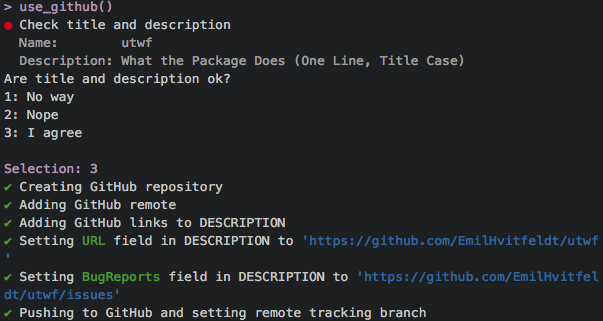 the only acronym it finds is “Umauma Triple Water Falls” so we are good to go. Next, we need to make sure that you have set up usethis, for this section I’ll refer to the original documentation usethis setup as it explains these steps better than I could.