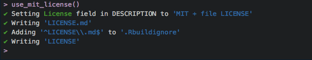 Next, we will license the package. This can be done using one of the following functions (we will use MIT for this example)