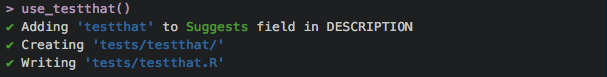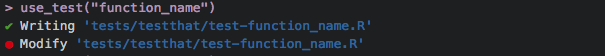 This function is very important and you will using it a lot, not only will it create the files you save your functions in, but it will also open the files if they are already created, this makes navigating your R files much easier. Once you have created your function it is time to add some tests! This is done using the use_test() function, and it works much the same way as the use_r().