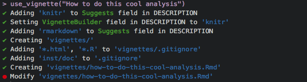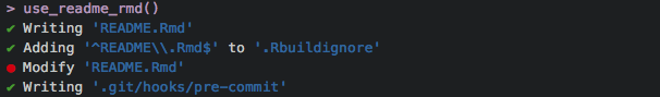 You have worked and have created something wonderful. You want to showcase the work. First, go knit the readme.Rmd file and then run these commands again to check that everything is working.