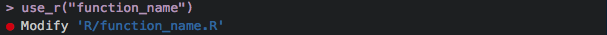 Writing code most likely includes writing functions, this is helped by the use_r() function by adding and opening a .R file that you write your function in