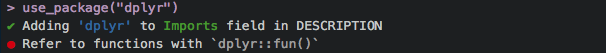 In the creating of your functions, you might need to depend on another package, to add a function to the imports field in the DESCRIPTION file you can use the use_package() function