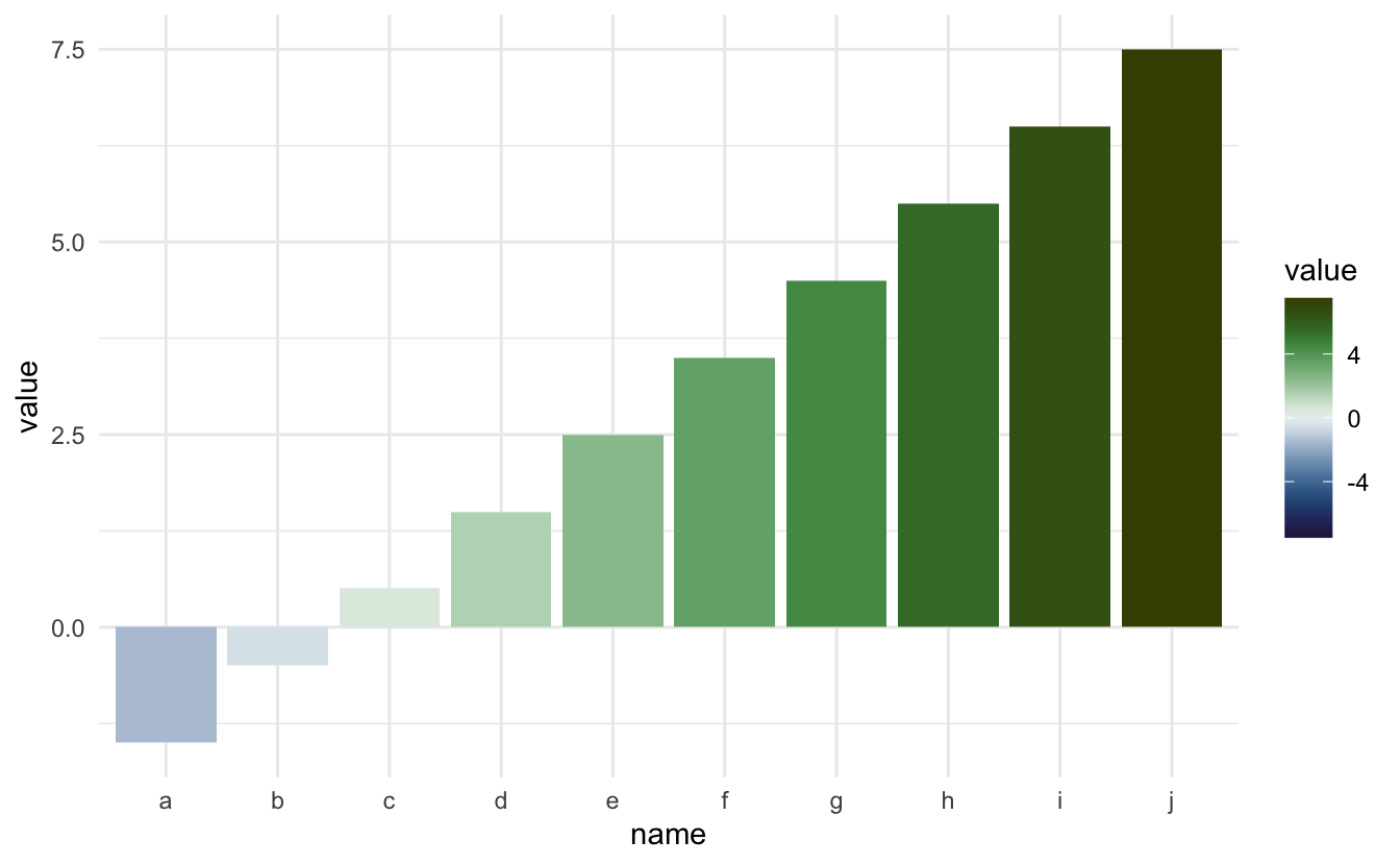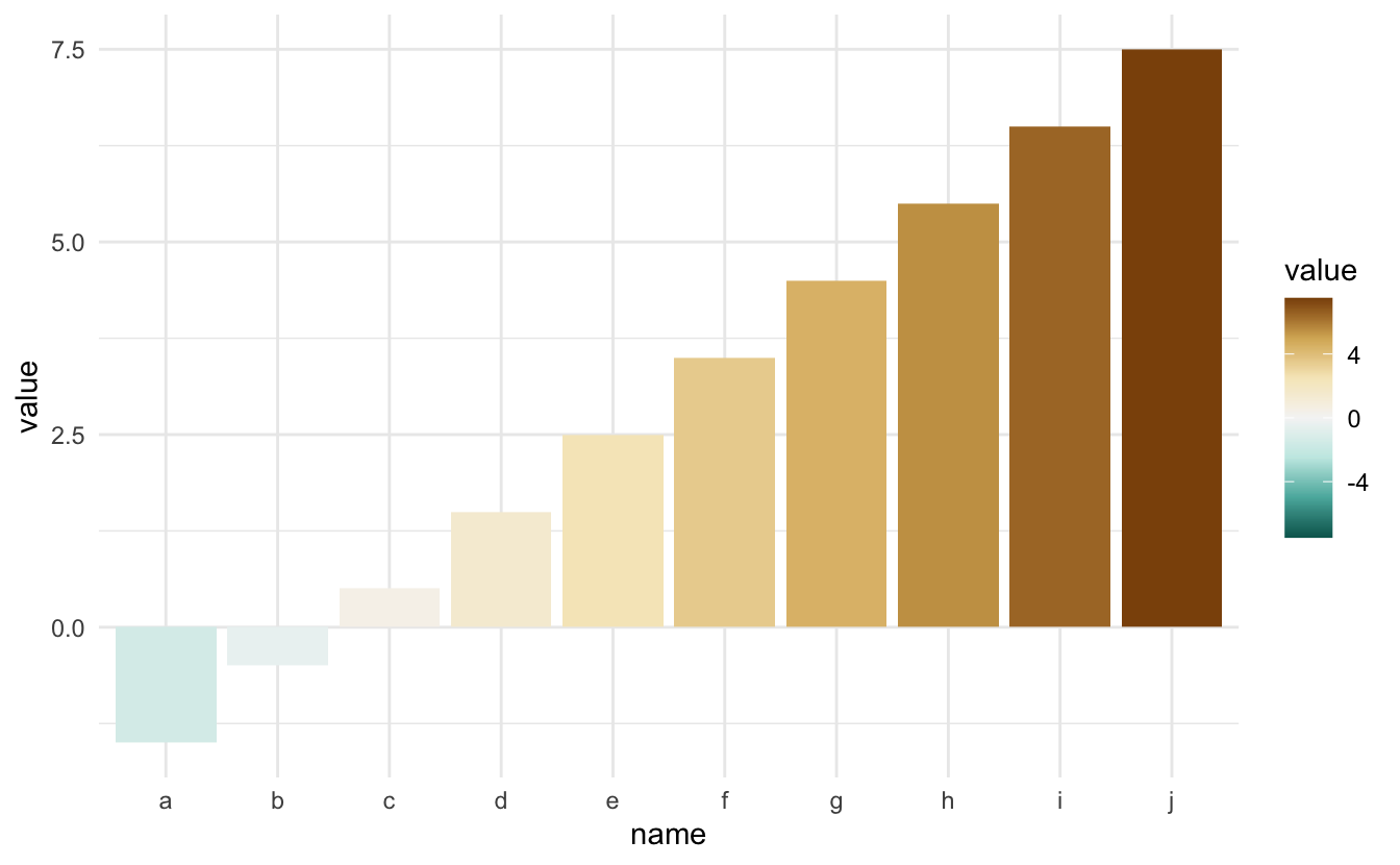 Using a sequential palette for a chart like this doesn’t give us much insight. Lets add a divergent scale with scale_fill_gradient2(). While it is doing its job, you still have to define the colors yourself.