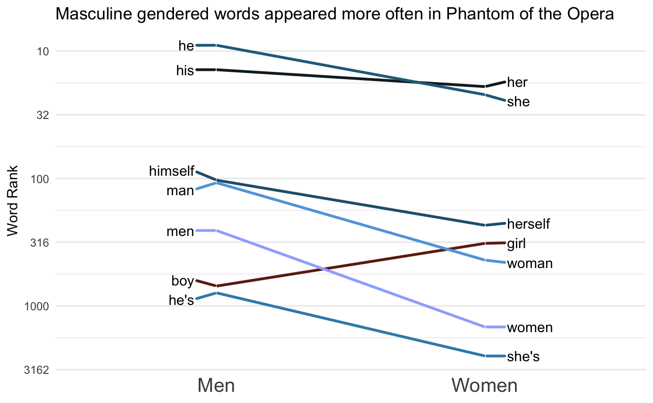 labs(title = "Masculine gendered words appeared more often in Phantom of the Opera")