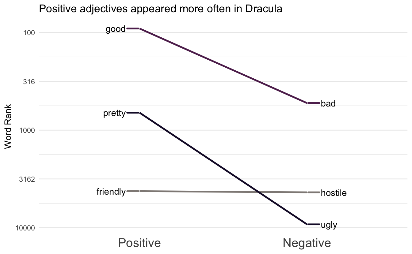 I have been working on visualizing how different kinds of words are used in texts and I finally found a good visualization style with the slope chart. More specifically I’m thinking of two groups of paired words.