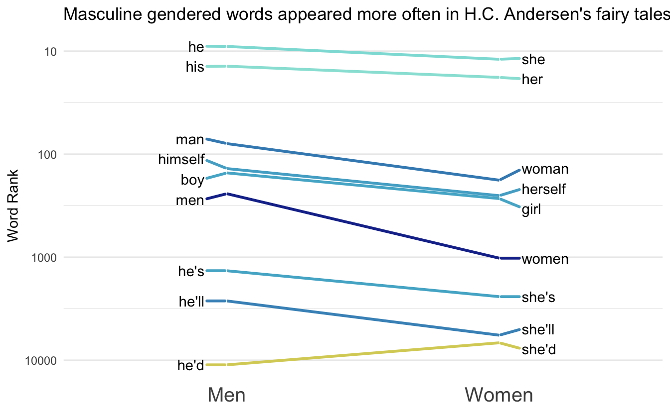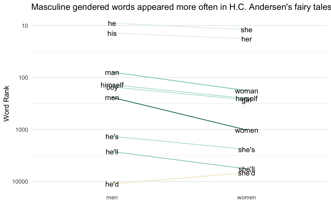 labs(title = "Masculine gendered words appeared more often in H.C. Andersen's fairy tales")