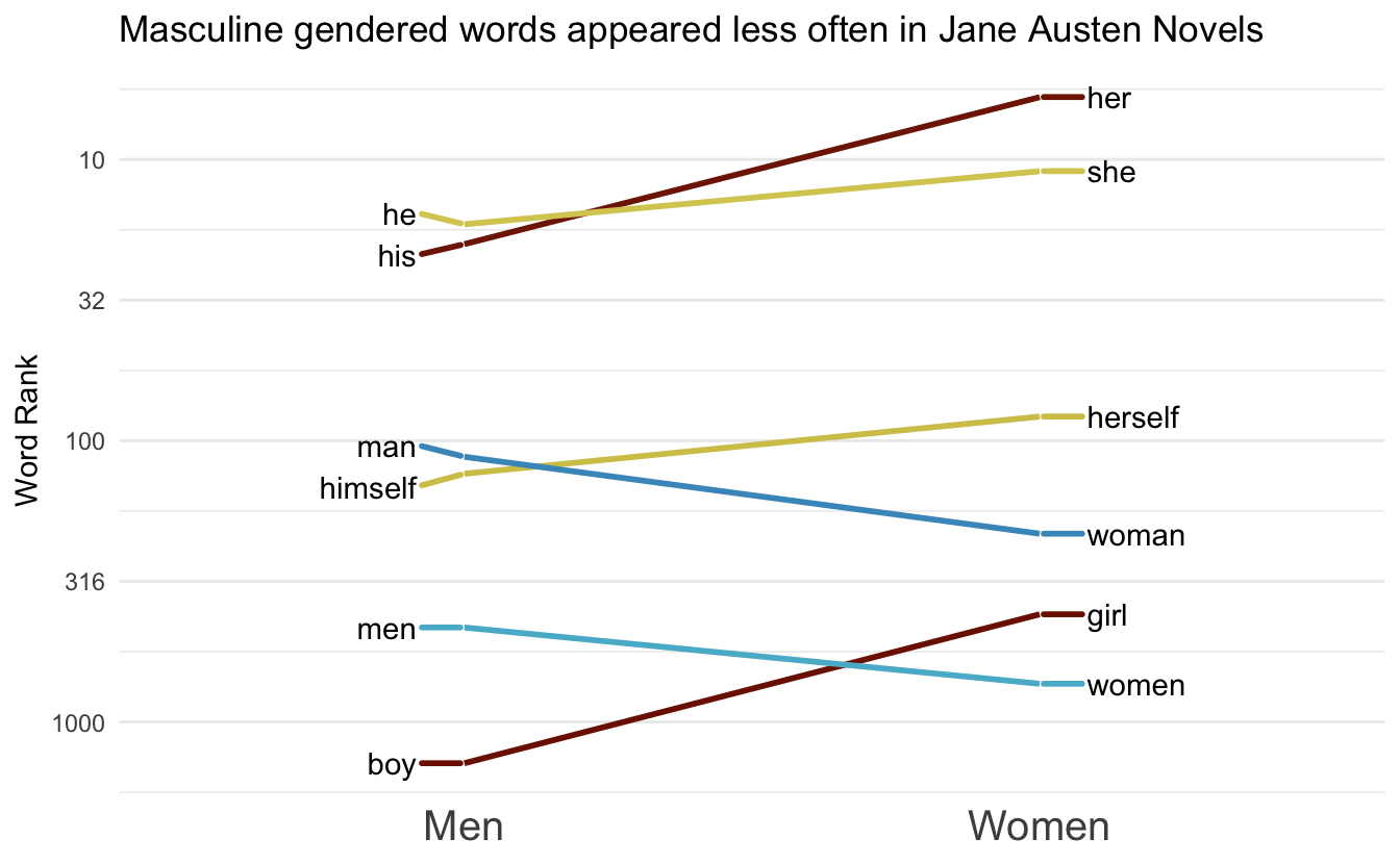 labs(title = "Masculine gendered words appeared less often in Jane Austen Novels")