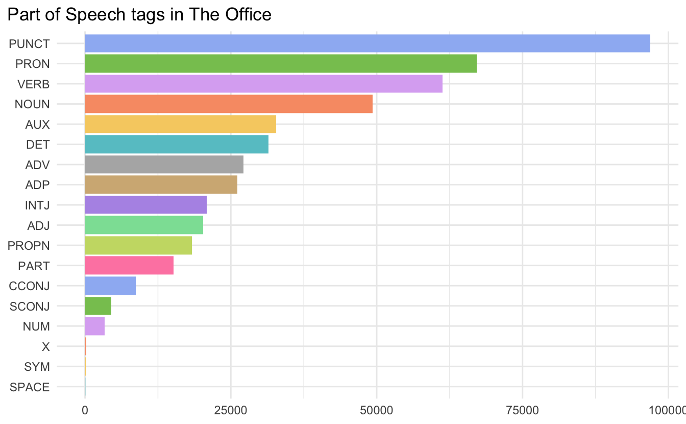 unnest_tokens(text, text, token = spacy_pos, to_lower = FALSE)Below is a chart of the number of each part of speech tags. The meaning of the acronyms can be found here if you click on the Universal Part-of-speech Tags button.