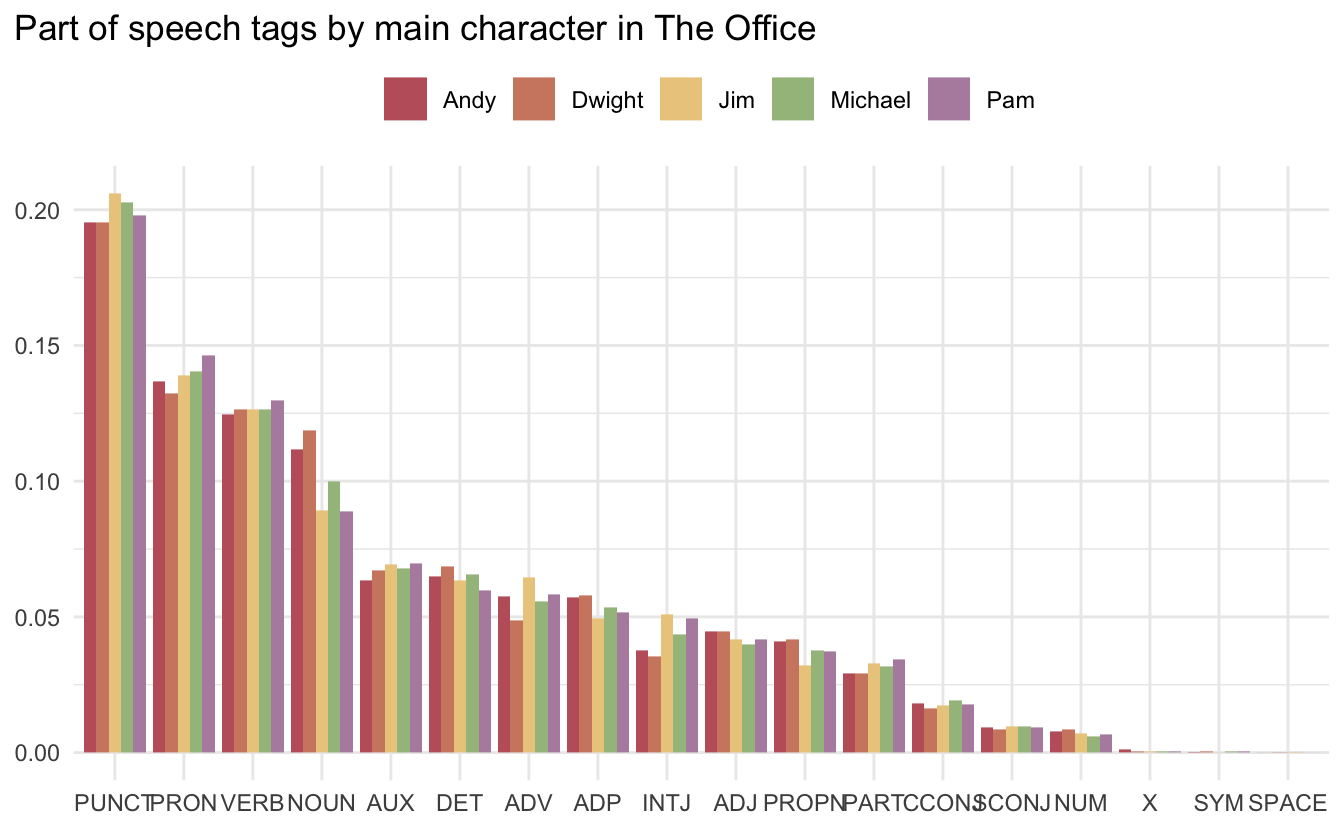 I found it initially surprising that punctuation (PUNCT) was leading the chart. But after thinking about it a little bit, I can imagine it has something to do with all the lines being very short and having to end in some kind of punctuation.