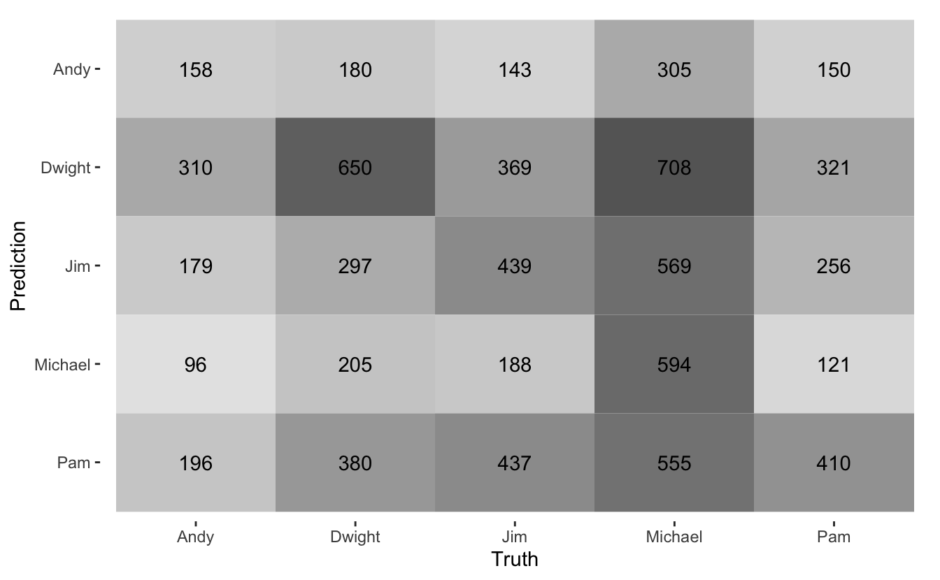 ## # β¦ with 763 more rowsMicheal, Dwight, Jim, and Pam are dominating the charts. This is unsurprising since they are some of the main characters having a central role in the episodes they appear in. This will be too many classes for the scope of this post so Iβll limit it to the top 5 characters with the most lines since the number drops off more after the first 5.
