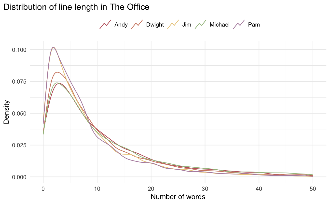 These lines are thankfully pretty similar, which will make it easier for us to make a good predictive model. However, we can still see some differences. Pam and Jim both have shorter lines than the rest, and Michael and Andy both have fewer shorter lines in exchange for more long lines.